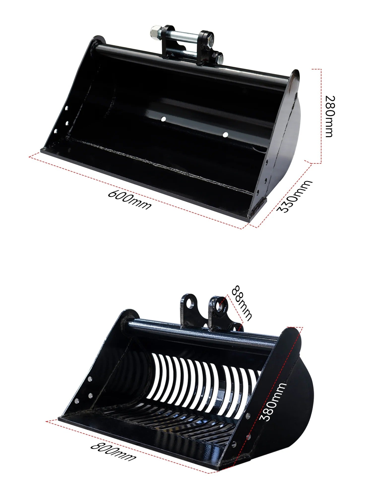 - Comprehensive Kit: This 8-piece mini excavator attachment kit includes a quick coupler, narrow bucket, ripper, rake, 600mm flat bucket, 200mm auger, grapple, and an 800mm sieve bucket.